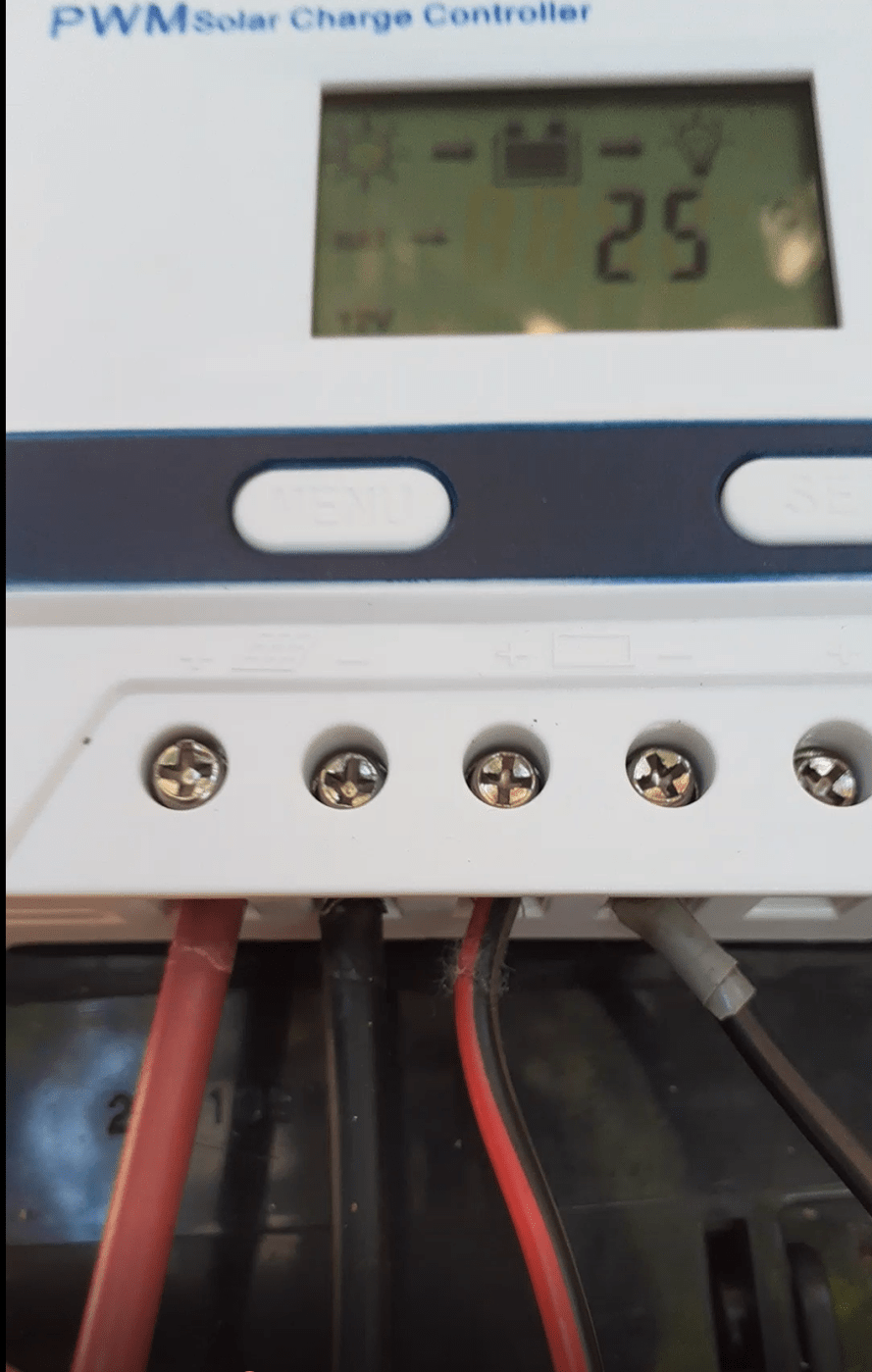 まずは➁ソーラーチャージと➂バッテリーを繋ぎます、そうしたらバッテリーのマークがソーラーチャージコントローラの画面に表示します。
